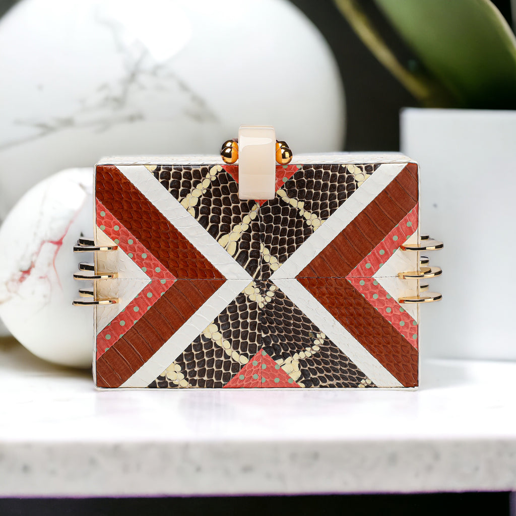 Kendra is a true epitome of sophistication and style. This exceptional multicolor women's clutch bag genuine snakeskin is meticulously crafted to captivate, featuring an eye-catching X-quilted pattern in a vibrant array of colors that exudes timeless elegance.