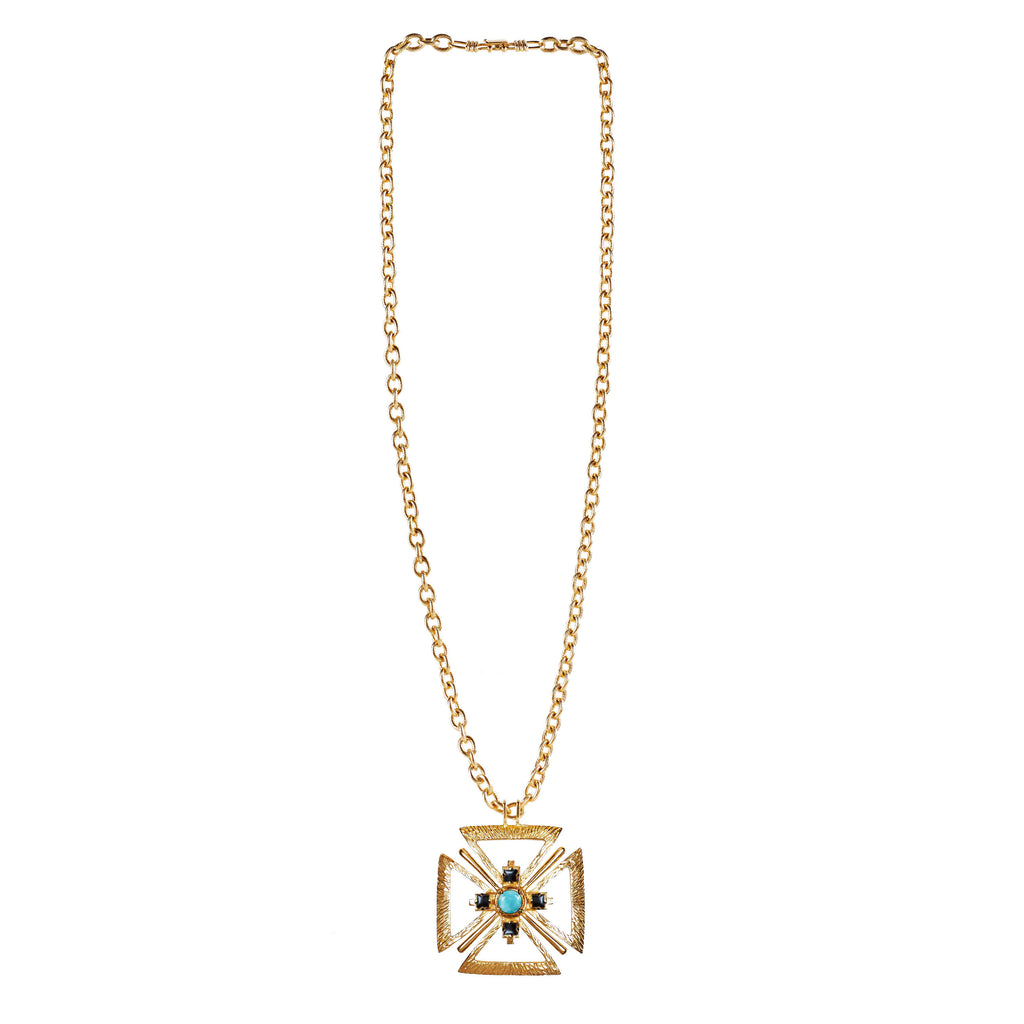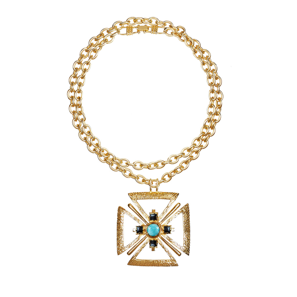 Named after the Greek goddess of protection, the Soteria Maxi Necklace features a bold Maltese cross pendant set with Amazonite and squared agate stones -symbols of calm, resilience and clarity. The textured double-link chain can be worn long or wrapped twice as a choker, offering styling versatility with sculptural impact.